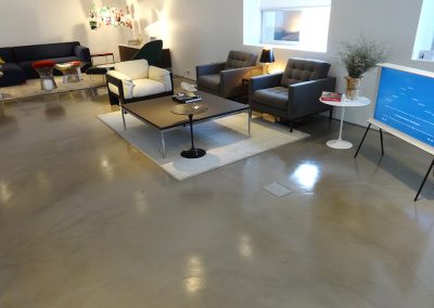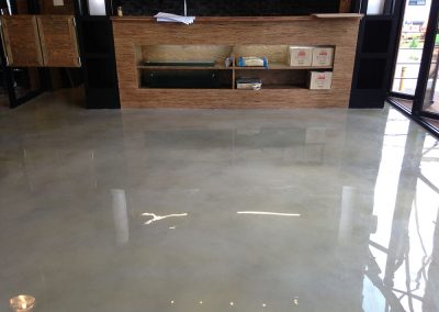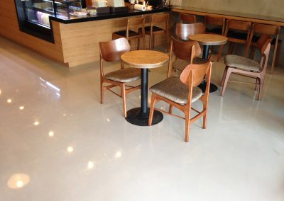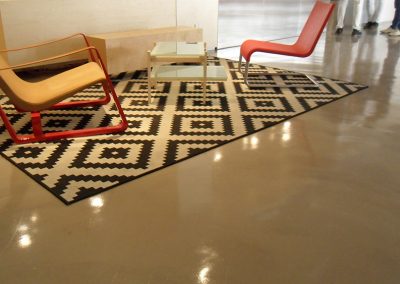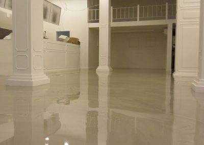 장점 이음새 없는 대리석질감의 마감연출이 가능, 통바닥이라 공간이 훨씬 넓어보이며, 전시장 바닥의 경우 시선이 분산되지 않아 전시물에 시선이 집중 되게 할수 있고, 시공시 사용자나 설계자의 다양한 디자인을 연출 또는 적용할수 있다.